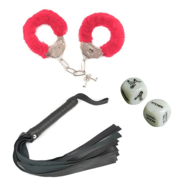 - Η συσκευασία περιέχει 1 ζευγάρι πονηρά ζάρια, γούνινες χειροπέδες και 1 μαστίγιο